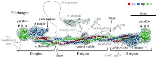 - Kollman, J.M.; Pandi, L.; Sawaya, M.R.; Riley, M.; Doolittle, R.F. Crystal Structure of Human Fibrinogen. Biochemistry 2009, 48, 3877–3886. [Google Scholar] [CrossRef]