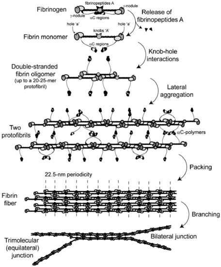 - Litvinov, R.I.; Pieters, M.; de Lange-Loots, Z.; Weisel, J.W. Fibrinogen and Fibrin. In Macromolecular Protein Complexes III: Structure and Function; Harris, J.R., Marles-Wright, J., Eds.; Springer International Publishing: Cham, Switzerland, 2021; pp. 471–501. ISBN 978-3-030-58971-4. [Google Scholar]