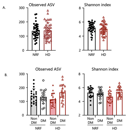 The α-diversity indices of the microbiome did not differ between patients with NRF and those undergoing HD (Figure 1A) and did not differ depending on kidney function. These indices also did not differ according to diabetic or renal function status (Figure 1B).