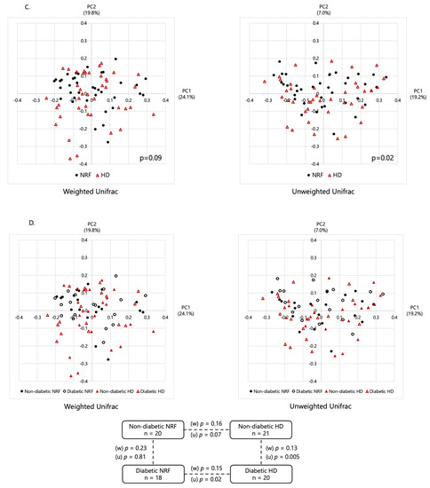 As shown in Figure 1C,D, there was a significant difference in β-diversity based on the unweighted Unifrac distance between patients with NRF and those undergoing HD (permutational multivariate analysis of variance (PERMANOVA), p = 0.02), and between patients undergoing HD with and without type 2 diabetes (p = 0.005). The Jaccard and Bray–Curtis indices are shown in Supplementary Figure S1A,B. These results suggested the existence of structural alterations in the gut microbiome depending on renal function and the underlying etiology of ESKD, i.e., non-diabetes or diabetes. However, β-diversity analysis based on weighted Unifrac distance showed only nominal differences between patients with NRF and those undergoing HD (p = 0.09), and between patients undergoing HD with and without type 2 diabetes (p = 0.13) (Figure 1C,D). Thus, the fecal microbial structure differed significantly between these groups, with effects apparently depending on kidney function and the cause of ESKD.