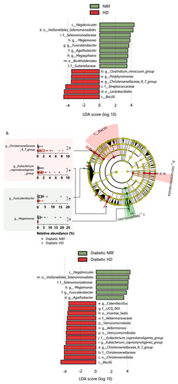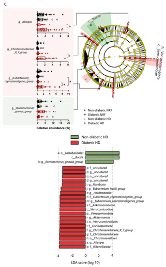 Panel (A) shows the enriched bacterial taxa in patients with NRF and those undergoing HD, panel (B) shows enriched taxa in diabetic patients with NRF and those undergoing HD, and panel (C) shows enriched taxa in patients undergoing HD with and without type 2 diabetes. All comparisons were made using the linear discriminant analysis (LDA) Effect Size method. Only taxa with absolute log(LDA) scores exceeding 3.5 are shown. *: p < 0.05, †: p < 0.01, ‡: p < 0.001, §: p < 0.0001. The p-values in panels (A,B) are calculated by Student’s t-test and in panel (C) by two-way ANOVA.