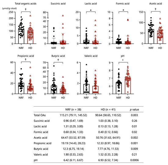 Comparisons of organic acids and pH in stool between patients with NRF and those undergoing HD. *: p < 0.05, †: p < 0.01, ‡: p < 0.001. The p-values for comparisons between patients with NRF and undergoing HD were calculated by Student’s t-test.