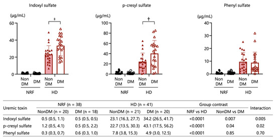 Comparisons of plasma uremic toxins (indoxyl sulfate, p-cresyl sulfate, and phenyl sulfate) among patients with NRF with and without type 2 diabetes and those undergoing HD with and without type 2 diabetes. †: p < 0.01, ‡: p < 0.001. The p-values for comparisons between each group were calculated by two-way ANOVA.