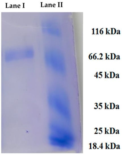 Purified hemocyanin from the hemolymph of H. pugilinus on SDS-PAGE. Lane I, protein molecular marker, mw appropriately 80 kDa; Lane II, purified hemocyanin.