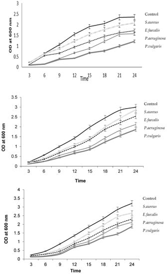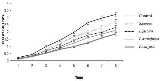 H. pugilinus hemocyanin was purified via Sephadex G-100 gel filtration chromatography, and a single band with a molecular weight of 80 kDa was observed in SDS-PAGE (Figure 1, Supplementary Figure S1) with a retention time of 4.3 min. CD scanning showed a broad n-π transition centered around 210 nm and an intense p-p transition at 190 nm due to weak peptide bonds and β sheets. The sharp negative peaks near 208 nm and 220 nm represent the α-helix and β-sheets in the protein structure. In addition, the negative peak near 240 nm indicates an abundance of β-turn in the protein structure. Thus, the CD analysis revealed the presence of α-helix (4.5%), β-sheets (23.6%), β-turn (17.2%) and random coils (54.8%) in the secondary structure (Supplementary Figure S2). The ani-bacterial activity of H. pugilinus hemocyanin was evaluated against Gram-positive Staphylococcus aureus and Enterococcus faecalis, and Gram-negative Pseudomonas aeruginosa and Pseudomonas vulgaris. Bacterial growth is shown in the graphical growth diagram. There was H. pugilinus hemocyanin concentration-dependent inhibition of bacterial growth. The minimum inhibitory concentration (MIC) of H. pugilinus hemocyanin was found to be 1–5 μg/mL, at which the growth of both Gram-negative and Gram-positive bacteria was inhibited significantly (Figure 2 and Figure 3).