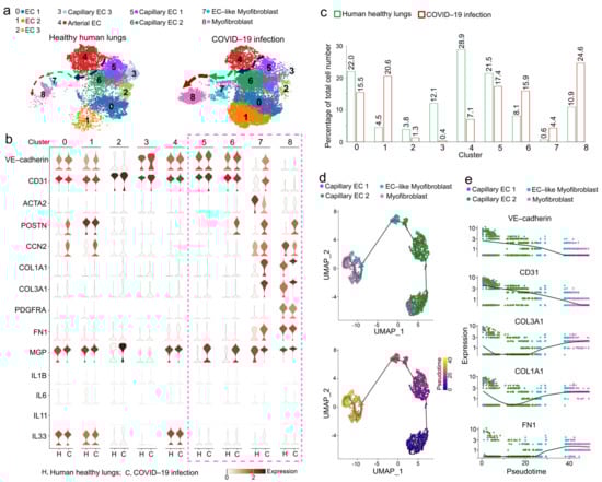 To examine the effect of COVID-19 infection on pulmonary endothelial lineage cells, we analyzed publicly available data, which contained one pulmonary scRNA-seq dataset from ten normal human lungs and three patients with COVID-19-related pulmonary fibrosis [9]. The Uniform Manifold Approximation and Projection (UMAP) revealed significant alterations in the composition of pulmonary endothelial lineage cells in these patients (Figure 1a). The percentage of EC-like myofibroblasts that expressed both endothelial and myofibroblast markers, ACTA2, CCN2, POSTN, COL1A1, COL3A1 FN1, and PDGFRα [11,12,13,14] (cluster 7), and myofibroblasts (cluster 8) were robustly increased in these patients (Figure 1a–c). The percentages of different EC types were altered. EC 2 (cluster 1) and capillary EC 2 (cluster 6) were increased. EC 1 (cluster 0) and EC 3 (cluster 2), capillary ECs 1 and 3 (clusters 3 and 5), and arterial ECs (cluster 4) were decreased (Figure 1a–c). Interestingly, the cell differentiation trajectory projected a clear direction that originated from capillary EC 1 (cluster 5) to capillary EC 2 (cluster 6), towards EC-like myofibroblasts (cluster 7), and ending with myofibroblasts (cluster 8) (Figure 1d). COVID-19 infection elevated capillary EC 2 about two-fold to promote the transition from ECs to myofibroblasts (Figure 1c). Following this trajectory direction, gene expression dynamics showed a decrease in endothelial markers with an increase in myofibroblast markers (Figure 1e and Figure S1). The upregulated CCN2 and POSTN in EC 1 and EC 2 suggested that COVID-19 infection induced an excess production of extracellular matrix in ECs and contributed to fibrosis [15,16]; however, the differentiation of EC 1 and EC 2 were not connected to myofibroblasts (Supplemental Figure S2). Previous studies have shown that COVID-19 could trigger a cytokine storm in lung tissues [17,18,19,20,21]. We analyzed the expressions of cytokines, such as IL1β, IL6, IL11, and IL33. We found that expressions of IL1β, IL6, and IL11 were very low in ECs and EC-derived myofibroblasts, and there was no change in IL33 expression due to COVID-19 infection in these cell clusters (Figure 1b). This is consistent with previous reports where other cell types are responsible for cytokine secretion in COVID-19 infected lungs, such as immune cells [17,18,19,20,21]. Together, the results suggested that COVID-19 caused a cell transition from ECs towards EC-like myofibroblasts and myofibroblasts to contribute to pulmonary fibrosis in COVID-19 patients. The analysis also identified an induction of MGP in EC 3, capillary ECs 1 and 2, EC-like myofibroblasts, and myofibroblasts (Figure 1b). A previous study suggested that MGP regulates the activity of Bone Morphogenic Protein-1 (BMP-1) and controls the differentiation of EC-like myofibroblasts [9]. Here, the induction of MGP in ECs, EC-like myofibroblasts, and myofibroblasts indicated that the activation of this differentiation pathway by COVID-19 infection might induce MGP to regulate this unwanted activation.