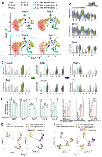 To determine if other viral infections affected pulmonary endothelial lineage cells, we analyzed another set of publicly available scRNA-seq data, which were obtained from mouse lungs with the influenza A viral infection [22]. We analyzed the endothelial lineage cells. The UMAP identified five EC clusters (clusters 0, 1, 3, 4, and 6) and three clusters of EC-like myofibroblasts 1, 2, and 3 (clusters 2, 5, and 7) (Figure 2a–c). The composition of EC-like myofibroblasts (clusters 2, 5, and 7) was dramatically increased after one day of viral infection and gradually increased as the infection continued (Figure 2d). EC-like myofibroblasts 1, 2, and 3 expressed endothelial markers and different levels of myofibroblast markers, suggesting that these cells were undergoing the transition to myofibroblasts (Figure 2b,c and Figure S3). EC-like myofibroblast 1 (cluster 5) expressed Acta2, Tagln, Postn, Col1a1, and Col3a1 but showed no expression of Pdgfra and Fibronectin 1 (Fn1), suggesting these cells were in early transition towards myofibroblasts. EC-like myofibroblast 2 (cluster 7) expressed less Acta2, Tagln, Col1a1, and Col3a1 but expressed more Pdgfra and Fn1, suggesting these cells were in mid-transition towards myofibroblasts. EC-like myofibroblast 3 (cluster 2) expressed more Pdgfra, Fn1, Col1a1, and Col3a1 but had no expression of Acta2 and Tagln, suggesting that these cells were in a late transition to myofibroblast (Figure 2c). Compared to a mock infection, the cell differentiation trajectory after a 3-day infection confirmed the pathway from EC-like myofibroblasts 1 to 2, ending with 3 (Figure 2e). The percentages of ECs were again altered. The percentages of ECs 1, 2, and 4 (clusters 0, 1 and 4) were decreased and ECs 3 and 5 (clusters 3 and 6) were increased (Figure 2d), suggesting that specific EC populations contributed to the EC-like myofibroblasts. The cell differentiation trajectory along the time course of viral infection suggested that EC-like myofibroblasts 1, 2, and 3 were derived from EC 2 (Figure 2e,f). The analysis also showed a specific pattern of MGP expression in EC 2 and EC-like myofibroblasts 1, 2, and 3 along the time course of infection (Figure 2b), again supporting that MGP may regulate the transition from ECs to EC-like myofibroblasts.
