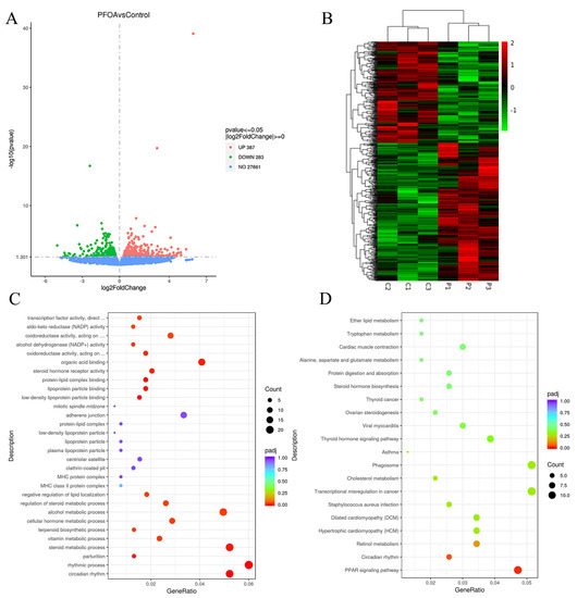 Transcriptome results showed that a total of 670 DEGs were identified by comparing the PFOA treatment group with the control group. Of these, 387 and 283 genes were up-and down-regulated in the PFOA group (Figure 3A). Figure 3B shows the heat map of differential gene expression between the control and PFOA groups. The expression levels of different genes between the two groups could be observed.