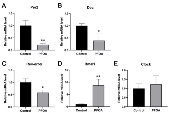 The mRNA levels of per2, rev-erbα, and dec were decreased in the PFOA group, while the expression of bmal1 was significantly increased. Interestingly, clock expression was unchanged in the PFOA group compared to the control group.