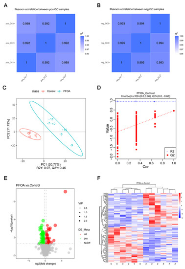To verify the effect of PFOA exposure during pregnancy on renal metabolites of offspring mice, liquid chromatograph mass spectrometry (LC-MS) was used to conduct untargeted metabolomics analysis on kidney tissues. To avoid interference from external factors, it was necessary to control the data quality. Therefore, the correlation coefficient between QC samples was calculated. The higher the correlation of QC samples, the better the stability of the whole test process. The correlation analysis of QC samples in positive and negative modes is shown in Figure 5A,B. R2 was close to 1, which indicates that the test data are reliable.