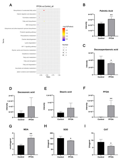 Analysis of all annotated altered metabolites by KEGG enrichment showed that the main pathways involved in these altered metabolites included the biosynthesis of unsaturated fatty acids, vitamin digestion and absorption, pyrimidine metabolism, fatty acid biosynthesis, and ABC transporters (Figure 6A). Among these, the biosynthesis of unsaturated fatty acids had the strongest correlation, which enriched altered metabolites, including palmitic acid, docosanoic acid, stearic acid, and docosapentaenoic acid. Compared with the control group, the relative concentrations of palmitic and docosapentaenoic acids significantly increased and decreased, respectively. PFOA was the most significantly altered metabolite, with significantly higher PFOA levels observed in the PFOA-exposed group (Figure 6B–F). As shown in Figure 6G–I, PFOA exposure significantly decreased (p < 0.05) the activities of catalase (CAT) and superoxide dismutase (SOD) in kidney tissue. The malondialdehyde (MDA) levels increased (p < 0.01) in the PFOA-exposed group.