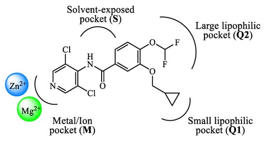 The design and development of PDE4 inhibitors as drug candidates dates back to the 1980s [24,25]. Successful agents demonstrated to specifically interact with the PDE4 active site [26], which has been established to consist of a divalent metal pocket (i.e., ‘M pocket’, for Zn2+ and Mg2+ that operate the hydrolysis of cAMP), two Q pockets (i.e., ‘Q1 and Q2 pockets’, characterized by the presence of hydrophobic residues) and a solvated pocket (i.e., ‘S pocket’, a solvent filled region characterized by the presence of polar residues). More in detail, further structural analysis highlighted that: (i) the M pocket contains highly conserved hydrophobic and polar residues which coordinate the metal ions; (ii) the Q1 pocket is a small hydrophobic pocket pointing away from the S pocket, while the Q2 pocket results larger than Q1 and adjacent to the S pocket; (iii) the S pocket consists mainly of hydrophilic amino acids and is filled with a network of water molecules which have a role in the formation of enzyme-inhibitor complexes in several cases. These four pockets can be occupied by the inhibitors through a series of binding interactions (as an, e.g., Figure 1 depicts the interactions of roflumilast, a first generation PDE4 inhibitor, in the active site of the enzyme), for instance hydrophobic interactions with conserved phenylalanine and isoleucine residues have been widely reported [27]. Furthermore, several inhibitors have been shown to occupy the active site in the region surrounding the Q pockets by establishing three main interactions: (i) coordination to the metal ions, often mediated by molecules of water; (ii) hydrogen bonds within the ‘nucleotide recognition area’; (iii) interactions with various hydrophobic residues in different parts of the active site. Overall, the therapeutic properties of PDE4 inhibitors are linked to their ability to suppress the activity of various endogenous mediators of inflammation (e.g., TNF-α, IL-10, and IL-12), as well as to inhibit the expression and elevation of cell adhesion molecules participating to the immune response [28], and the possible clinical value of many of them has been assessed in a variety of trials for several disease conditions.