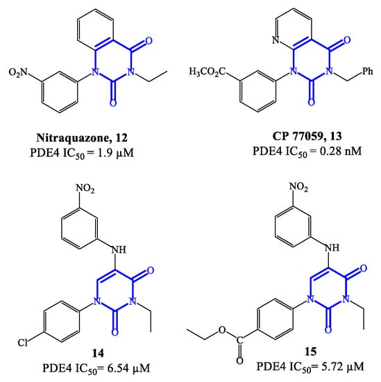 Subsequently, simplified analogues of nitraquazone have also been developed, where the fused bicyclic system was replaced by a single pyrimidinedione or pyridinone core [57]. The PDE4 inhibitory potency of these series of simplified analogues is overall lower, being the IC50 values, in most cases, in the micromolar range. However, several 5-anilino derivatives, such as 14 (with a para-Cl-phenyl residue at position 1 of the pyrimidine-2,4-dione scaffold) and 15 (with the same structure of 14, but with an ethyl ester that replaces the chlorine in the same position) (Figure 4) exhibited an interesting biological profile and a high selectivity for PDE4 (i.e., vs. PDE3 and PDE5). In particular, the IC50 values reported for 14 and 15 are 6.54 μM and 5.72 μM, respectively, and both analogues do not show affinity and inhibitory effects towards PDE3 and PDE5 [58]. This suggests that further development of new series based on these structures could lead to the identification of more potent inhibitors, also endowed with high specificity for PDE4.