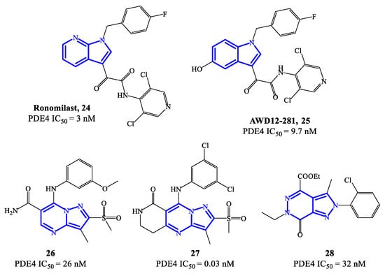 Ronomilast 24 (also known as ELB353) (Figure 7) is a PDE4 inhibitor based on a 1H-pyrrolopyridine core, developed for oral administration to treat pulmonary diseases. ELB353 demonstrated an IC50 = 3 nM, a remarkable pharmacokinetic profile in vivo and high efficacy in inhibiting LPS-induced pulmonary neutrophilia [66]. Moreover, it showed not to trigger severe side effects in ongoing Phase I clinical trials. Compound 25 (AWD12-281) (Figure 7) is a hydroxylated indole-based derivative that was designed as an alternative for topical administration. For PDE4 inhibitors, topical route has many advantages over the oral route, such as long-term therapeutic benefits in a focused compartment of the body (e.g., the lung) and minimal systemic exposure which may limit adverse reactions. Overall, AWD12-281 was a selective PDE4 inhibitor (IC50 = 9.7 nM), suitable for administration via dry powder drug inhalation [67], being therefore evaluated in clinical trials for the treatment of lung inflammatory diseases, primarily COPD. Moreover, the possible use of AWD12-281 has also been investigated in acute and chronic phases of atopic dermatitis, due to the remarkable properties of penetrating human skin and determine anti-inflammatory effects.