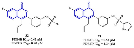 Isocoumarin-based derivatives containing in position C-3 a meta-substituted phenyl with aminocarboxamide or amino-sulfonyl groups were also developed as PDE4 inhibitors [74]. Within this series, compounds 32 and 33 (Figure 9) demonstrated to possess relatively moderate inhibitory affinity toward PDE4B, with IC50 = 0.43 μM and 0.54 μM, respectively. In these derivatives, the allyl group increases the lipophilic character and is considered important for improved bioavailability. Through SAR and in silico studies, it has also been confirmed that: (i) the presence of the NH (in the sulfonamide) in meta on the benzene linked to the isocoumarin at position C-3 significantly improves the inhibitory effects towards PDE4; (ii) the introduction of the sulfonamide in meta on the benzene is more effective than in para; (iii) the oxygen atoms of the sulfonamide function can form a hydrogen bond with the His450 residue in the active site of the enzyme, while the aromatic substituent can form π–π stacks with Phe586 [74]. However, the selectivity of compounds 32 and 33 towards PDE4B was limited overall, wait a IC50 = 0.90 and 1.34 μM on PDE4D, and further structure optimization approaches would be required to access analogues that may enable clinical evaluation [74,75].