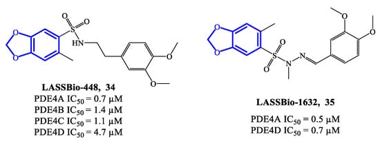 LASSBio-448 (34) (Figure 10) is a benzodioxole-based derivative that inhibits all four PDE4 isoforms and was originally designed as an oral PDE4 inhibitor for the treatment of asthma. LASSBio-448 has IC50 = 0.7 μM, 1.4 μM, 1.1 μM and 4.7 μM towards PDE4A, PDE4B, PDE4C and PDE4D, respectively [76]. It demonstrated relevant efficacy in reversing the LPS-induced lung inflammation and inhibiting several pathological conditions linked to the inflammatory state, such as mucus exacerbation, peribronchiolar fibrosis, lung eosinophilic infiltration and allergen-induced airway hyperreactivity. Moreover, in comparison to rolipram, LASSBio-448 produced lower side effects, possibly due to its moderate activity on PDE4D [76]. Molecular docking studies highlighted similarities and differences in the binding mode of LASSBio-448 towards PDE4 isoforms. Noteworthy, the 3,4-dimethoxyphenyl ring has been found to form π–π stacking interactions with Phe372 residue in all PDE4 subtypes. LASSBio-448 is also involved in van der Waals interactions with Ile336, Met337 and Phe340 in PDE4A, [76], while a hydrogen bond with the NH-group of the conserved Gln369 has been found with PDE4B. In general, the docking on PDE4B exhibited some differences in the orientation of the molecule, in comparison to the poses obtained with PDE4A. Moreover, the two oxygen atoms of the 1,3-benzodioxole ring and the sulfonyl group can form interactions with other amino acid residues in PDE4B, such as Cys358, His160 and His204. In the case of PDE4D, LASSBio-448 has also shown to form hydrogen bonds in the metal ion pocket of the active site [76,77]. In order to optimize this prototype, a novel class of derivatives containing a sulfonyl hydrazone function were synthesized and reported in 2020. Within the library, compound LASSBio-1632 (35) (Figure 10) inhibit PDE4A and PDE4D with IC50 = 0.5 μM and 0.7 μM, respectively. Moreover, compound 35 demonstrated to suppress the expression of TNF-α and inhibit LPS-induced airway hyperreactivity in lung tissues [77], opening possibilities of further preclinical validation in inflammatory disease models.