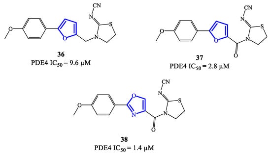 Five-membered heterocycles have also been investigated as scaffolds to access clinically relevant PDE4 inhibitors. In 2020, compounds 36, 37 (based on a 2,5-disubstituted furan) and 38 (based on 2,4-disubstitued oxazole) (Figure 11) were reported as PDE4 inhibitors generated through a lead optimization research program focusing on SCH 351591 7 (i.e., a quinoline-based agent; Figure 3) [54]. The IC50 values recorded on PDE4 for 36–38 are in the micromolar range, i.e., 9.6, 2.8 and 1.4 μM, respectively [78]. Through docking studies, it has been possible to define relevant features of the binding mode of this class of inhibitors, such as: (1) the presence of an amide function linked to the heterocycle (in 37 and 38) can strengthen the binding with PDE4 by forming a hydrogen bond with Gln443 in the hydrophobic region and, therefore, enhance the activity; (2) the thiazolidine ring contributes to the formation of hydrophobic interactions with Phe446 in the active site; (3) the oxygen of the p-methoxyphenyl group fills the ion pocket and may contribute to increase the inhibitory activity by interacting with the metal ions (i.e., Zn2+ and Mg2+) [78]. Due to their moderate activity, these new inhibitors need further development in terms of structural optimization, enabling to explore possibilities of clinical efficacy, if any.