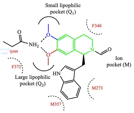 Rational modification of natural product structures has also been widely explored to generate novel libraries of PDE4 inhibitors. In this regard, berberine 42 (Figure 12), extracted from Coptis chinensis, has been found to interfere with PDE4 signaling [84] (along with many other physiological functions), offering great potential for structural modifications to access new PDE4-active series. For instance, molecular simplification approaches (carried out on berberine) led to the development of novel series of tetrahydroisoquinoline-based derivatives as potential PDE4D inhibitors 85,86], including compounds 43 and 44 (Figure 12), which have been biologically investigated for the treatment of asthma, COPD and psoriasis [85]. X-ray studies showed the relevant regions of the PDE4D active site that can interact with compound 43 (for a schematic representation, see Figure 13). In particular, the small lipophilic pocket Q1 was entirely occupied by one of the methoxy groups, while the other is not able to fill the lipophilic pocket Q2 in full (being this latter larger than Q1). Moreover, hydrogen bonds and π−π stacking interactions have also been found in the PDE4D catalytic site with conserved residues, such as Gln369 and Phe372 [86]. Since there is no obvious interaction between the ion pocket of PDE4 and compound 43, the development of new derivatives could focus on the introduction of functional groups which can specifically bind to the two metal ions (Mg2+ and Zn2+) in the ion pocket, as this is expected to enhance the inhibitory effects of the compounds on PDE4. With regard to compound 44 (Figure 12), this agent showed the most potent therapeutic efficacy for the treatment of psoriasis by topical administration. Although its potency (IC50 = 0.36 μM) is twice weaker than berberine and the analogue 43 (IC50 = 0.14 μM for both), as well as lower than apremilast (IC50 = 0.074 μM) used as reference in the biological studies [85,86], 44 demonstrated to effectively inhibit LPS-induced TNF-α production and reverse the imiquimod-induced psoriasis-like condition in murine models of skin inflammation, thus being worth of further investigation to support clinical studies.