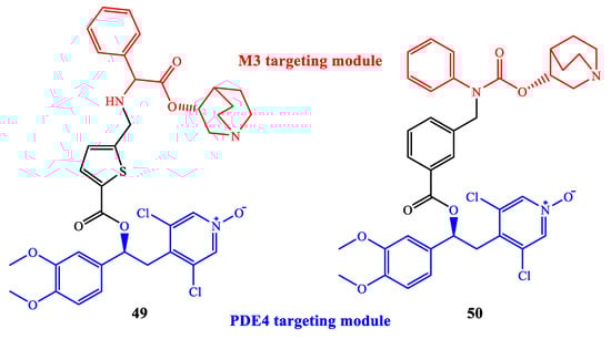 As an example, the combination in a single agent PDE4 inhibitor and M3 antagonist action has been widely recognized as highly beneficial for the treatment of pulmonary diseases via inhaled administration. In this regard, Armani et al. recently reported a family of dual ‘PDE4 inhibitor-M3 antagonist’ molecules developed as further elaboration of CHF6001 (i.e., tanimilast, a clinically validated PDE4 inhibitor) [97,98]. The combination of an appropriately selected fragment of CHF6001 (targeting PDE4) and an established molecular system as M3 antagonist (i.e., quinuclidine nucleus), linked together in the structure through an ester or carbamate function, led to the development of a series of dual M3/PDE4 agents (e.g., see compounds 49 and 50 in Figure 15), having high potency (i.e., nanomolar) on both targets, as well as anti-inflammatory efficacy in vitro and in vivo, worth of further investigation to support clinical translation.