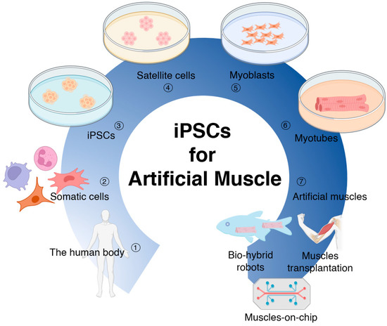 iPSCs have emerged as a promising tool in regenerative medicine and tissue engineering since their discovery in 2006 by Shinya Yamanaka and his colleagues [4]. They provide a new source for tissue engineering- and cell-based therapies without the ethical concerns associated with the use of embryos. iPSCs possess crucial characteristics, including pluripotency, allowing them to differentiate into various cell types found in the body, such as neurons [5], cardiovascular and hematopoietic lineages [6], cardio myocytes [7], and myogenic precursors [8]. These pluripotent properties make iPSCs an appealing candidate for generating tissue-engineered muscles with applications in transplantation, disease modelling for drug screening, and bio-hybrid robots. iPSCs also exhibit self-renewal capacity, enabling symmetrical division and the production of a large number of cells while maintaining their pluripotent properties. Furthermore, iPSCs can be derived from various tissue sources, including skin fibroblasts [9,10], peripheral blood mononuclear cells [11,12], and urinary cells [13,14] (Figure 1). This variety of tissue sources offers a potential solution to the shortage of donor organs and tissues. Patient-specific iPSCs can be utilized to generate satellite cells (myogenic progenitor cells, MPC) and artificial muscle tissues that are not susceptible to immune rejection, overcoming a significant hurdle in traditional allogeneic transplantation methods and eliminating the need for immunosuppressive drugs, thereby improving patients’ postsurgical quality of life.
