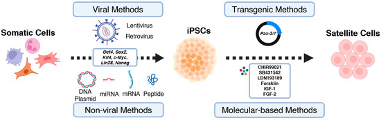 Considering the crucial role of MPC in muscle regeneration, the efficient differentiation of iPSCs into MPC is essential for building tissue-engineered artificial muscles. Various protocols and techniques have been employed to induce the generation of iPSC-derived MPC (iPSC-MPC). One commonly used approach is the gene-based approach, where key genes involved in satellite cell development and myogenic differentiation are introduced or modified. For instance, Pax-7, functioning in satellite cell specification and function [45], has been delivered into iPSCs to activate the myogenic program, leading to MPC generation [46,47,48] (Figure 2). Similarly, Pax-3, a homolog of Pax-7, also plays a role to confer myogenic fate in embryogenesis [49]; thus, combining transfection of Pax-7 and Pax-3 were also applied to manipulate the iPSC differentiation to MPCs [50] (Figure 2). Although this approach provides a powerful means to direct the fate of iPSCs toward the skeletal muscle lineage, the influence of inserted external genes on cell function and potential mutations needs to be considered. The success of transgenic approaches relies on the efficient monitoring and selection of cells expressing the desired myogenic markers during differentiation.