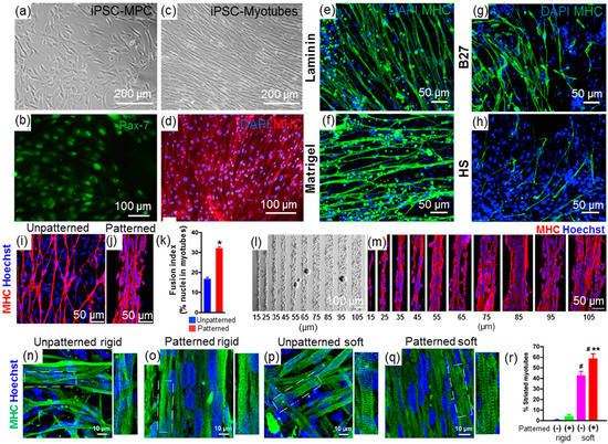 iPSC-derived myotubes and applications in a 2D system. (a,b) Representative images of iPSC-MPC with the expression of Pax-7. (c,d) Representative images of iPSC-myotubes with MHC expression, reproduced under the terms of the CC-BY Creative Commons Attribution 4.0 International license [66] Copyright 2021, Springer Nature. (e,f) Immunofluorescence staining of iPSC-myotubes after 14-day differentiation on the laminin or matrigel coatings. (g,h) Immunofluorescence staining of iPSC-myotubes at 14-day differentiation in medium with serum-free supplement (B27) or horse serum supplement; images reproduced with permission from the authors of [67] (Copyright 2017, Elsevier). (i,j) Immunofluorescence staining of iPSC-myotubes at 14-day differentiation on unpatterned or patterned substrates. (k) Fusion index evaluation of iPSC-myotubes on unpatterned or patterned substrates, * p < 0.01. (l,m) The iPSC-MPC and iPSC-myotubes linearly aligned on the patterned lanes with a series of widths between 15 and 105 μm. Images reproduced with permission from the authors of [68] (Copyright 2019, Wiley). (n–r) Physiologically soft surface promotes the formation of myotube striation. (n–q) Immunofluorescence staining of iPSC-myotubes at 14-day differentiation on soft or rigid substrates. (r) Percentage of striated myotubes in various conditions. # p < 0.05 compared to unpatterned soft and patterned rigid, and ** p < 0.05 compared to unpatterned soft. Images reproduced with permission from the authors of [68] (Copyright 2019, Wiley).