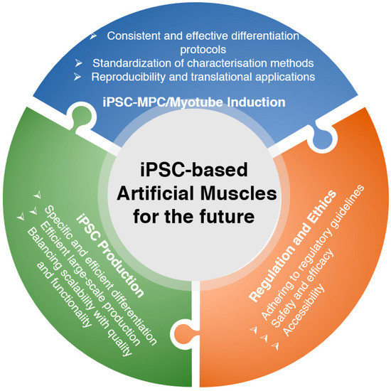 In conclusion, the selection of iPSC generation and iPSC-based artificial muscle generation methods are critical for the successful development of tissue-engineered artificial muscles. The advantages of using iPSCs, including their preferable cell sources, potential for patient-specific drug discovery, and future improvements in human muscle function and neuromuscular junctions, hold great promise for the field. However, several limitations need to be addressed, including the development of novel differentiation protocols, improved characterization methods, and efficient large-scale production methods. Regulatory considerations and functional limitations, such as unspecific differentiation, should also be taken into account for the practical application and clinical translation of iPSC-based artificial muscles.