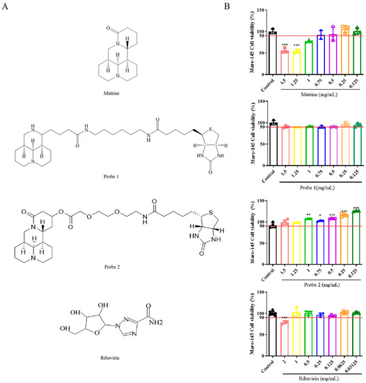 The chemical structures of the compounds are shown in Figure 1A. Biotin-labeled matrine probe 1 and 2 were synthesized via hydrolysis ring-opening and non-ring-opening, respectively. The results of MNTC determined via MTT assay (Figure 1B) showed that matrine had no cytotoxic effect on Marc-145 cells when the concentration was less than or equal to 0.75 mg/mL. Probe 1 and probe 2 had no cytotoxicity on Marc-145 cells in the tested concentration range, and the cell viability was greater than 90%. When the concentration of ribavirin was less than or equal to 1 mg/mL, the cell viability was greater than 90%. Therefore, the MNTC of each compound on Marc-145 cells was as follows: matrine 0.75 mg/mL; probe 1 1.5 mg/mL; probe 2 1.5 mg/mL; ribavirin 1 mg/mL. MNTC was selected for subsequent experiments.