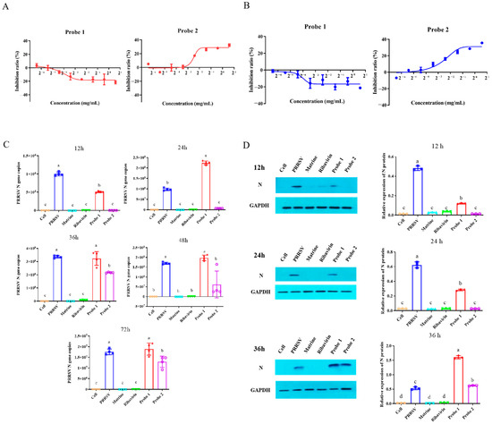 Identification of probe anti-PRRSV activity. (A) PRRSV was infected and then treated with probe. The inhibition rate of probe 1 and probe 2 on PRRSV-infected Marc-145 cells was detected via MTT assay. The curve showed that the inhibition effect of probe on PRRSV was dose-dependent. n = 3. (B) PRRSV was co-treated with probe, and the inhibition rate of probe 1 and probe 2 on PRRSV-infected Marc-145 cells was detected via MTT assay. The curve showed that the inhibition effect of probe on PRRSV was dose-dependent. n = 3. (C) qPCR was used to detect the expression of PRRSV N gene at 12 h, 24 h, 36 h, 48 h and 72 h after PRRSV and probe co-treatment. The data are represented as the mean ± SD from at least three samples and three experiments that showed similar results via one-way ANOVA. Different letters (a–c) indicate significant differences between groups, p < 0.05. (D) Western blot was used to detect the expression of PRRSV N protein at 12 h, 24 h and 36 h after PRRSV and probe co-treatment. The data are represented as the mean ± SD from at least three samples and three experiments that showed similar results via one-way ANOVA. Different letters (a–d) indicate significant differences between groups, p < 0.05.