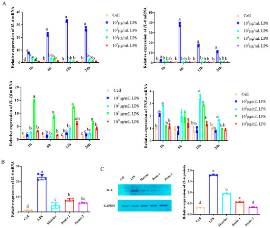 The relative expression levels of IL-6 mRNA and IL-6 protein in Marc-145 cells treated with LPS and probe for 12 h were detected via qPCR and Western blot, respectively. The results of qPCR (Figure 3B) showed that the relative expression of IL-6 mRNA in LPS group was significantly higher than that in cell control group (p < 0.05), indicating that the inflammatory model was successfully established. Compared with the LPS group, the relative expression of IL-6 mRNA in the probe 1 and probe 2 groups was significantly decreased (p < 0.05). Western blot results (Figure 3C) showed that the relative expression of IL-6 protein in the LPS group was significantly higher than that in the cell control group (p < 0.05). Compared with the LPS group, the relative expression of IL-6 protein in the probe 1 and probe 2 groups was significantly decreased (p < 0.05). The results showed that probe 1 and probe 2 had significant anti-inflammatory effects.