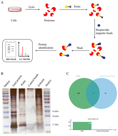 Molecular target fishing experiment. (A) ABPP target fishing experiment flow chart. The biotin-labeled matrine probe was co-incubated with the cell lysate. After incubation with streptavidin magnetic beads, the matrine target proteins were enriched on the streptavidin magnetic beads. (B) SDS-PAGE-silver nitrate staining was used to identify the target fishing results. The probe group showed strong protein bands around 17 kDa and 26–34 kDa, indicating potential targets for matrine. (C) The intersection of ABPP identification results and network pharmacology prediction targets.