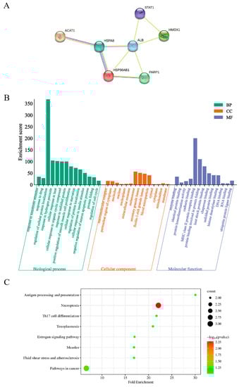 The seven selected candidate proteins were input into the String database to obtain the protein–protein interaction network (Figure 5A). The number of nodes was seven, the number of edges was nine, the expected number of edges was four, the average node degree value was 2.57, the average local clustering coefficient was 0.757, and the PPI enrichment P value was 0.0213. This means that there may be more interactions between these seven proteins, which are synergistic or interlinked in some biological functions.