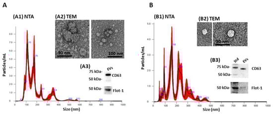 EV characterization by nanoparticle tracking analysis (NTA) showed that the size distribution of the EVs was in an approximate range of 40–570 nm for plasma-EVs (Figure 1A) and 40–450 nm for CSF-EVs (Figure 1B). EVs were imaged by TEM (Figure 1(A2,B2)) and assessed by Western blotting, showing positive for CD63 and flotillin-1 (Figure 1(A3,B3)).
