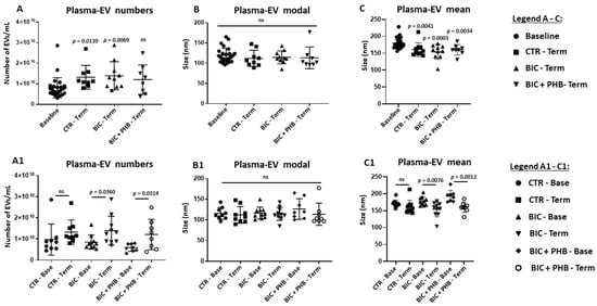 NTA analysis of piglet plasma-EVs from all experimental groups. (A) Quantification of plasma-EVs as assessed by NTA analysis, comparing baseline (time zero) to vehicle control group at termination (CTR-Term), seizure group at termination (BIC-Term) and seizure group plus treatment (phenobarbitone) at termination (BIC + PHB-Term). (A1) EV numbers in plasma for the same groups but showing each group separately at baseline and terminal points. (B) Comparison of modal EV size in plasma, between the four treatment groups. (B1) Plasma-EV modal size for the same groups but showing each group separately at baseline and terminal points. (C) Comparison of mean EV size in plasma, between the four treatment groups. (C1) Plasma-EV mean size for the same groups but showing each group at baseline and terminal point. ANOVA; exact p-values are indicated (significant differences at p < 0.05; ns = no significant differences. See legend key for individual groups (circles, squares, triangles, diamonds) within the figure.