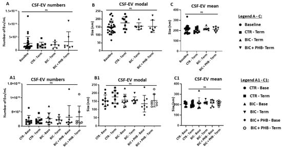 The quantification of EVs from the CSF showed no significant differences between CSF-EV numbers comparing the terminal groups with the baseline, and in addition, no significant differences were observed between the terminal groups (Figure 3A); some outliers were observed for the base group and terminal group receiving phenobarbitone treatment (BIC + PHB-Term). Comparing the CSF-EV modal size, no significant differences were observed between the four groups (Figure 3B). When assessing the mean EV size in CSF, no significant differences were observed between the groups (Figure 3C), contrary to what was seen in plasma. To assess possible intergroup differences (and hence the putative skewing of data due to individual differences), the different treatment groups were also represented at base and terminal time points for all four groups in Figure 3 (A1–C1), showing that for all groups, CSF-EV numbers, CSF-EV modal size and CSF-EV mean size were not significantly modified.