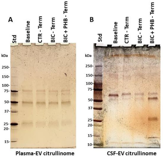 F95-enriched (pan-citrulline) protein fractions are shown by SDS-PAGE and silver staining. (A) The citrullinome of plasma-EVs; (B) The citrullinome of CSF-EVs. The F95 enriched proteins are shown per lane for the four different groups (Baseline, CTR-Term = saline vehicle control at terminal point; BIC-Term = seizure group at terminal point; BIC + PHB-Term = seizures plus phenobarbitone treatment at terminal point); the protein standard (std) is indicated in the far-left lane in kilodaltons (kDa).