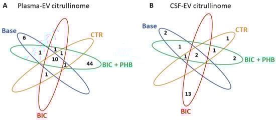 The Venn diagrams in Figure 5 represent the number of shared and specific citrullinated protein hits identified in the control and treatment groups in plasma-EVs (Figure 5A) and CSF-EVs (Figure 5B), respectively.