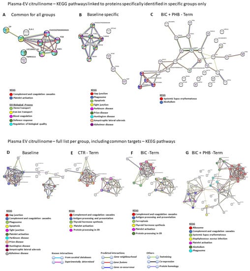 A comparison between the KEGG pathways identified in the four groups for the plasma-EV citrullinome is furthermore summarized in Table 3, highlighting common and unique KEGG pathways associated with the citrullinated protein targets in each treatment group.