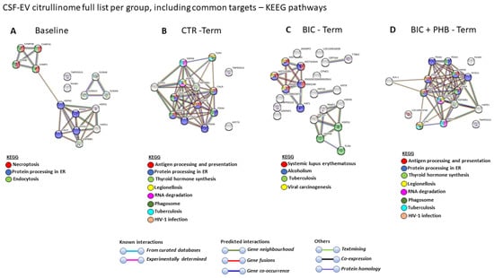 The CSF-EV-citrullinome-associated protein interaction networks were analyzed for the four different treatment groups, based on the citrullinated protein targets identified per group and listed in Table 2. For citrullinated hits in CSF-EVs of the baseline group, the following three KEGG pathways were associated: necroptosis, protein processing in the endoplasmic reticulum and endocytosis (Figure 7A). For citrullinated protein hits of the CSF-EVs from the vehicle control terminal group (CTR-Term), the following eight KEGG pathways were associated: antigen processing and presentation, protein processing in the endoplasmic reticulum, thyroid hormone synthesis, legionellosis, RNA degradation, phagosome, tuberculosis and human immunodeficiency virus 1 infection (Figure 7B). For citrullinated protein hits of CSF-EVs in the seizure terminal group (BIC-term), four KEGG pathways were associated: systemic lupus erythematosus, alcoholism, tuberculosis and viral carcinogenesis (Figure 7C). For citrullinated protein hits of CSF-EVs in the seizure plus phenobarbitone treatment terminal group (BIC + PHB-Term), eight KEGG pathways were associated: antigen processing and presentation, protein processing in the ER, thyroid hormone synthesis, legionellosis, RNA degradation, phagosome, tuberculosis and HIV infection (Figure 7D).