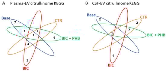 Venn diagrams of KEGG pathways associated with the EV citrullinome in a piglet model of neonatal seizures. (A) KEGG pathways associated with the plasma-EV citrullinome; (B) KEGG pathways associated with the CSF-EV citrullinome. The number of shared/common KEGG pathways associated with citrullinated target proteins identified for the different treatment groups is indicated. Baseline (Base), vehicle control at termination (CTR), seizure group at termination (BIC), the seizure group + phenobarbitone treatment at termination (BIC + PHB).
