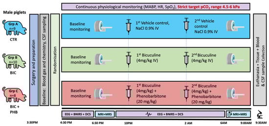 Healthy, Large White male piglets (Sus scrofa) (24–75 h) (n = 27) were sedated with midazolam (0.2 mg/kg i.m.) and anesthetized with inhaled isoflurane (1.5–3% v/v). The piglets were mechanically ventilated through tracheostomy (SLE 2000 infant ventilator, Surrey, UK). An umbilical arterial catheter (Vygon, Surrey, UK) was installed for continuous invasive blood pressure monitoring and blood sampling. An umbilical and a cephalic venous catheter (Vygon, Surrey UK) were installed for fluid infusions. Infusions included fentanyl (3 mcg/kg/h) for analgesia and 10% dextrose (60 mL/kg/d) for maintenance fluid. Piglets were placed prone in a custom-built MRI compatible incubator (LMT Medical Systems, Lübeck, Germany). Temperature was maintained at 38 °C throughout using a Criticool thermal regulation system (Belmont Medical Technology, Wokingham, UK). Piglets were continuously monitored with systemic monitoring (MX750, Philips Healthcare, Farnborough, UK, and 1025T, SA Instruments Inc., London, UK), optical neuro monitoring and continuous video electroencephalogram (EEG) (Nicolet, Natus, WI, USA). After surgical procedures were completed, piglets were divided into three cohort groups to either receive normal saline vehicle (control group A (CTR), n = 9), bicuculine 4 mg/kg IV (pH 4–5) over 10 min (seizure group B (BIC), n = 10) to induce seizures or bicuculine 4 mg/kg IV (pH 4–5) over 10 min followed by phenobarbitone loading dose 20 mg/kg over 20 min, given 1 min after bicuculline infusion completed (treated seizure group C (BIC + PHB), n = 8). All cohort infusions were initiated at 0 h and repeated at 3 h. Prior to infusion, all piglets underwent a 2 h baseline monitoring period, followed by a baseline MRI scan. A second MRI scan was performed at 7 h, after which piglets were euthanized with a pentobarbital overdose (for experimental setup see Figure 9). For EEG, the duration of abnormal EEG activity was assessed by counting the number of minutes of abnormal brain activity on EEG for both dosing periods combined (Figure S1).