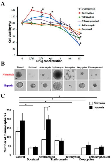 The effect of tested antibiotics on MCF-7 breast cancer cell proliferation and mammosphere formation: (A) MTT cell proliferation assay, X-concentration of antibiotics used in sphere formation experiments; (B) Representative photomicrographs of MCF-7 mammospheres under normoxia and hypoxia; (C) Number of mammospheres after 2 weeks of incubation under both normoxia (20% O2) and hypoxia (4% O2); shown are the means of 5 independent experiments using MCF-7 cells of different passages. * = p < 0.05.
