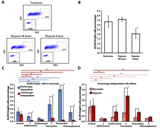 Interestingly, in normoxia, in anchorage-independent culture, azithromycin (0.3 ± 0.2%), erythromycin (0.4 ± 0.1%), doxycycline (0.4 ± 0.3%) and chloramphenicol (0.3 ± 0.1%) significantly reduced the ALDH-bright cell ratio, as compared to the control samples (1.7 ± 0.7%).