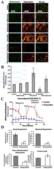 Doxycycline induces mitochondrial dysfunction in MCF-7 cells: (A) JC-1 staining of mitochondrial network in MCF-7 cells after exposure to antibiotics (the representative images), shift from red to green fluorescence represents depolarization of mitochondrial membrane potential. Scale bar = 50 μm; (B) MCF-7 cells after treatment were subjected to JC-1 staining. The ratio of JC-1 aggregates to monomer was significantly decreased in presence of doxycycline and increased with tetracycline and chloramphenicol. Error bars represent S.E.M. (n = 3; *—p ≤ 0.05; **—p ≤ 0.01); (C) Doxycycline inhibits both mitochondrial and non-mitochondrial respiration in MCF-7 cells; the metabolic profile of MCF-7 cell monolayers treated with doxycycline (25 μM) was assessed using the Seahorse XF-e96 analyzer; representative tracing of metabolic flux; (D) Dose-dependent significant reduction in basal respiration, maximal respiration, and non-mitochondrial respiration were observed (n = 3; **—p ≤ 0.01).
