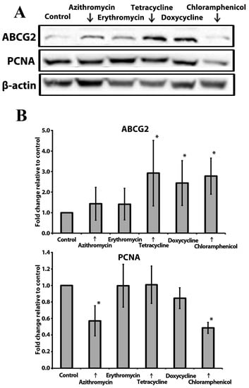 The ATP Binding Cassette Subfamily G Member 2 (ABCG2) functions as a transporter and plays a crucial role in the development of multi-drug resistance to chemotherapeutic agents []. ABCG2 has been shown to be a major chemotherapy resistance marker in MCF-7 cells []. Proliferating Cell Nuclear Antigen (PCNA) is a nuclear non-histone protein that is necessary for deoxyribonucleic acid (DNA) synthesis. PCNA is considered to be a marker of cell proliferation in various cancers. Upregulation of PCNA in breast cancers is associated with poor prognosis []. Therefore, in this study, we assessed the levels of ABCG2 and PCNA in MCF-7 mammospheres exposed to antibiotics (Figure 4A and Figure S3). ABCG2 was overexpressed in mammospheres treated with the antibiotics of the tetracycline class and chloramphenicol (Figure 4B). The PCNA level was reduced in chloramphenicol- and azithromycin-treated cells (Figure 4B).