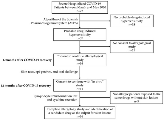 Patients were selected from our previous study, which was a prospective, observational, and descriptive study for which its main objective was to determine whether drug hypersensitivity could have been a cause of skin lesions in patients admitted to our hospital with SARS-CoV-2 infection between March and May 2020 [15]. Of the 72 patients included in this study, 37 were classified as having a possible drug-caused lesion according to the Spanish Pharmacovigilance System (ASPS) [16]. Of these, only 16 agreed to continue in the study. In all cases, a complete allergological study was performed via skin tests, epi-patches, and oral challenges against the drugs used during the period of infection and skin lesions [15]. In the present study, 11 of these 16 patients agreed to finish the “in vitro” study (Figure 1). We also included five nonallergic patients (NAPs) who were exposed to these drugs but did not develop lesions. The main treatments used were dolquine (hydroxychloroquine (HCQ)); azithromycin (AZT); kaletra (lopinavir/ritonavir (LOP/RIT)); and/or beta-lactam antibiotics, such as amoxicillin/clavulanic acid (AMOX/CLA) or ceftriaxone (Table 1).