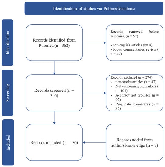 We found 362 total articles. Reviews, letters, editorials, commentaries and books or non-English papers were excluded before screening (n = 57). After carefully analysing the title and abstract and evaluating inclusion and exclusion criteria, n = 29 articles were included in the present review. We excluded n = 276 studies based on non-stroke related articles (n = 47), articles not concerning biomarkers (n = 102), articles without diagnostic accuracy data (n = 92) and articles on prognostic stroke biomarkers (n = 35). Finally, we add n = 7 articles from the authors’ knowledge Figure 1.