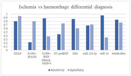 Among the biomarkers that distinguish these two types of strokes, GFAP appears to be the most studied. The rupture of the blood-brain barrier determines the apoptosis of astrocytes and the release of GFAP into the bloodstream [28]. Whereas in ischemia, such rupture occurs by depletion of ATP stores and dysfunction of the Na/K pump leading to apoptosis of the endothelium and astrocytes, in intracranial haemorrhage, there is a rapid and mechanical breakdown of the barrier [98]. This leads to a more rapid increase with higher concentrations of GFAP in intracranial haemorrhage than in ischemia [28]. Studies have shown high specificity and good sensitivity in the ICH/IS differential (specificity = 96.3–100%, LR+ 4.10–39.50, diagnostic OR: 23.11–326.93) [29,30,31,32]. The diagnostic accuracy seems to be directly proportional to the size of the hematoma, where for larger volumes of haemorrhage, there are greater increases in GFAP [30]. Association between GFAP and RBP4 showed worst diagnostic performance than GFAP alone (sensitivity 84%, LR+ 4.28, OR 11.36). The study of metabolomics and levels of amino acid metabolites in the blood through dried blood spot tests showed a difference in concentration in subjects with ischemic and haemorrhagic stroke [83]. The study results show good diagnostic accuracy of these biomarkers in the differential ICH/IS [83]. Good diagnostic performances were also achieved by S100b associated with RAGE [43] and by mi-RNA study [81]. In particular, mi-RNA124-3p showed good specificity in the differential between ischemic and haemorrhagic stroke [83]. (Figure 3 and Table 3).