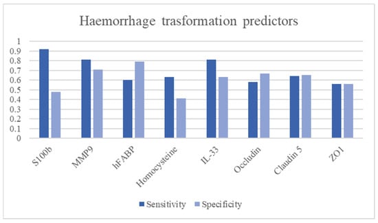 Intracranial haemorrhage represents the main contraindication to revascularization therapy in stroke [5,6]. Making a prompt diagnosis even before the execution of imaging techniques could determine a shortening of the timing of intervention and, therefore, a reduction in post-stroke mortality and morbidity [1,3]. An optimal biomarker that helps rule out haemorrhagic lesions should be characterized by a high specificity to be sure that if a patient results negative to the test haemorrhagic lesion is not present in the first hours (<4.5 h).