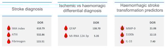 ATIII represents an ideal biomarker with high diagnostic accuracy in stroke diagnosis with high sensitivity (97.32%), high LR+ (15.25) and DOR (532.86). Furthermore, the conducted study demonstrates an early reduction of ATIII blood values during a stroke (<4.5 h) [72]. This feature depends on the immediate activation of the coagulation cascade due to the rupture of the hematoencephalic membrane, which leads to the consumption of ATIII [71]. In the same study, fibrinogen showed high diagnostic performance (sensitivity: 96.05%, LR+ 5.52, DOR: 115.51).